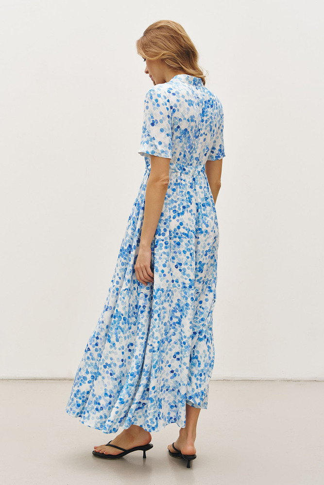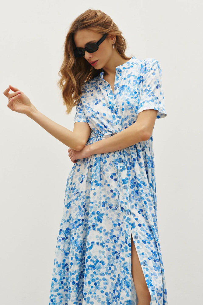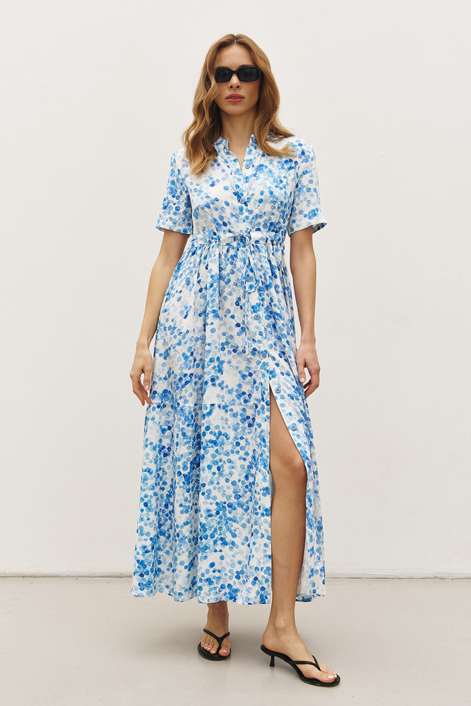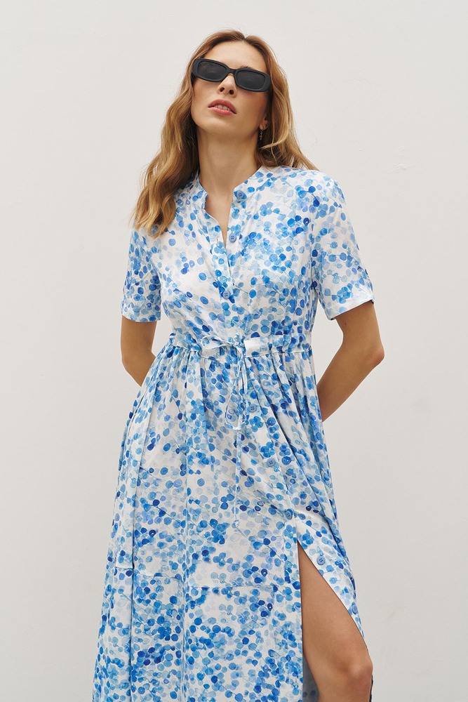 Синя свіжість акварельних мазків у поєднанні з легкою віскозою створює ідеальну сукню для літніх днів. Повітряна тканина дарує відчуття невагомості, а граційний силует підкреслює природну витонченість. Ніжний синій візерунок нагадує бризки морської хвилі, а фасон із ґудзиками та поясом додає елегантності й гармонійно акцентує талію. Струмлива спідниця із грайливим розрізом робить образ динамічним і привабливим. Це сукня, яка створена для легких прогулянок, романтичних вечорів і натхненних моментів, коли хочеться відчувати себе бездоганно.