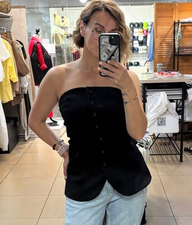 Костюмний корсет у класичному чорному кольорі — витончена база для елегантних і сучасних образів. Виріб має застібку на гудзики спереду та еластичну вставку ззаду, яка забезпечує комфортну посадку по фігурі. Прямий крій, виточки, щільна тканина — усе для того, щоб підкреслити талію та силует. Ідеально комбінується з піджаками, сорочками або носиться соло — як топ.